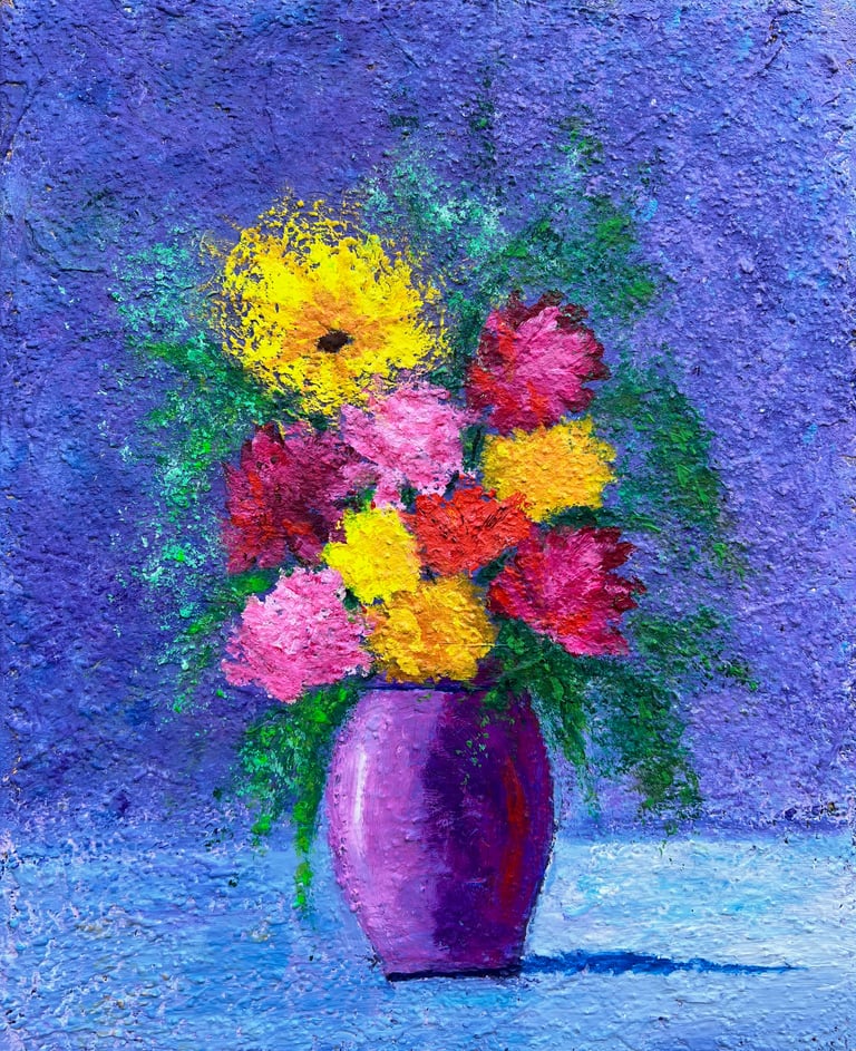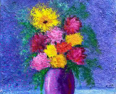 Flowers are one of nature's greatest gifts. I like painting them on a textured canvas, which imparts a luscious feeling of perfect imperfection. I achieve this with nontraditional materials such as plaster or joint compound mixed with coffee grounds and sand, creating movement and depth.