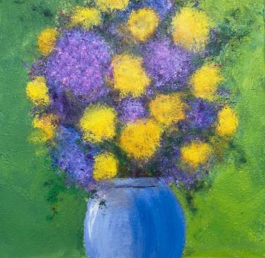 "Vase of Flowers" (Purple and Yellow) 2025, 14-by-18, acrylic on canvas. Inquire.