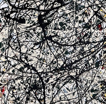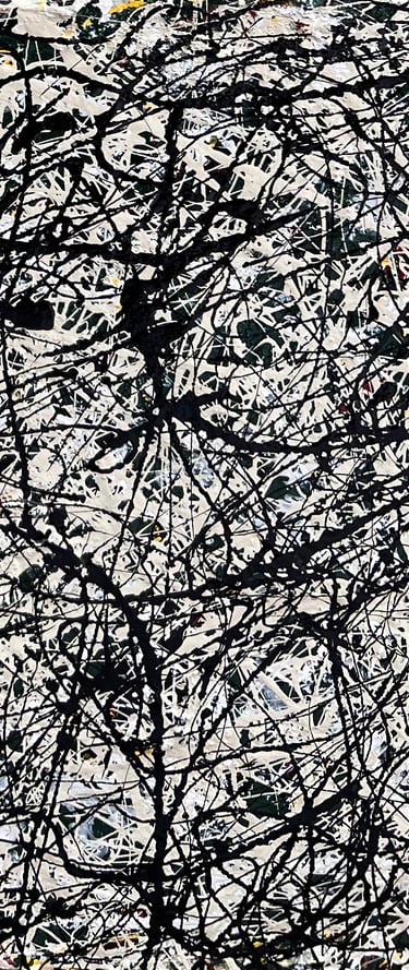 "Makers & Takers (Mini Fake Pollock)" (2025) 8-by-14 inches, Rust-Oleum Protective Enamel oil paint (gloss) over collage and acrylic paint on canvas. A small-scale tribute to the great abstract expressionist painter. Inquire.