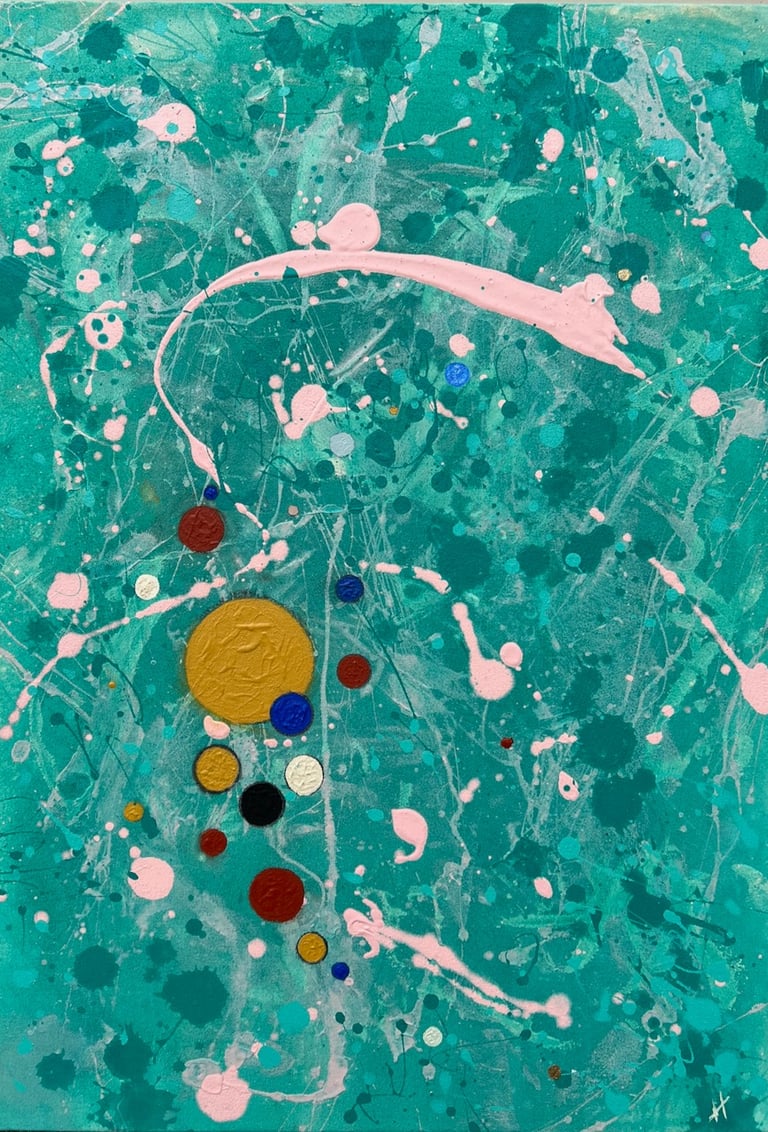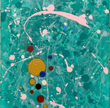 "Makers & Takers (Mini Fake Pollock)" (2025) 14-by-8 inches, Rust-Oleum Protective Enamel oil paint (gloss) over collage and acrylic paint on canvas. A small-scale tribute to the great abstract expressionist painter. Inquire.