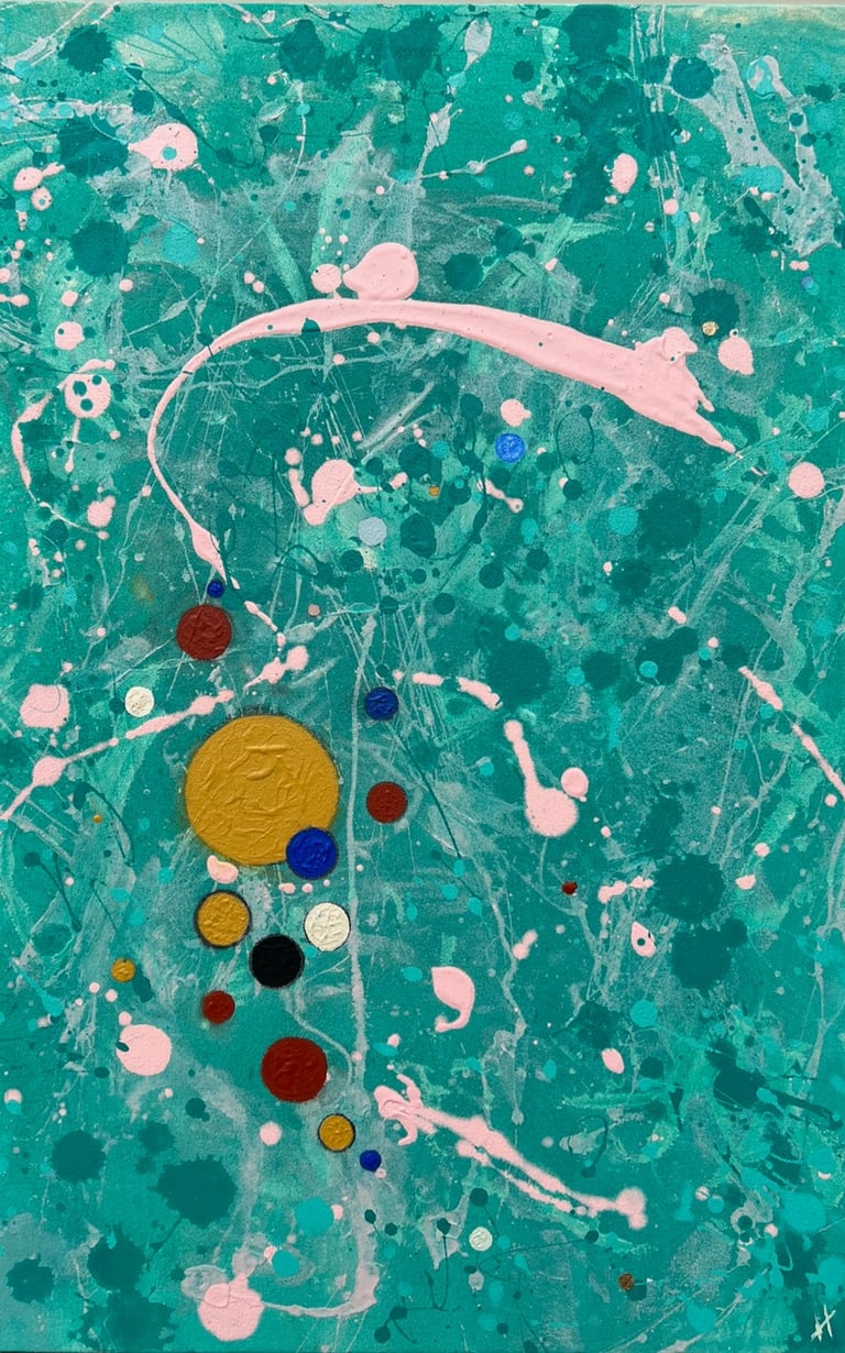 "Makers & Takers (Mini Fake Pollock)" (2025) 14-by-8 inches, Rust-Oleum Protective Enamel oil paint (gloss) over collage and acrylic paint on canvas. A small-scale tribute to the great abstract expressionist painter. Inquire.