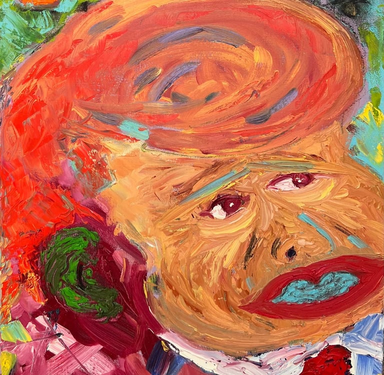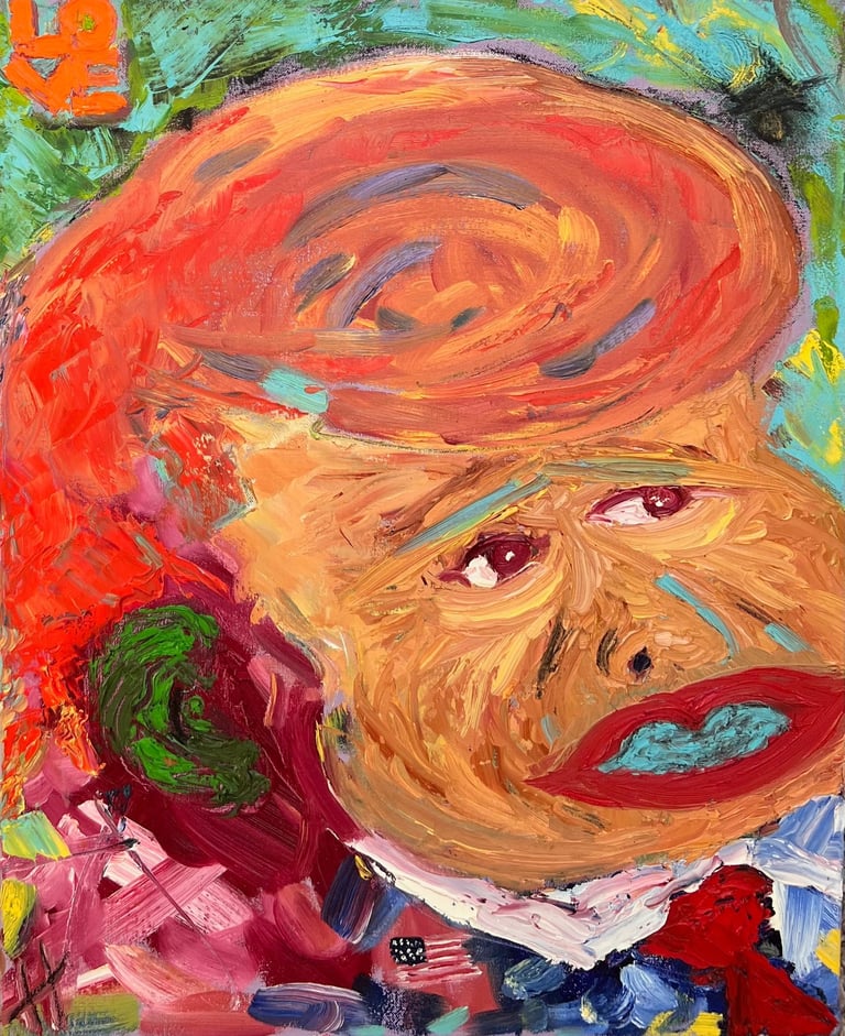 "Pink Lincoln" (2024) 20-by-16 mixed media on canvas. I worked from an AI-generated photograph based on Alexander Gardner's final photo of President Lincoln taken in Washington, D.C., in early 1865. Inquire.