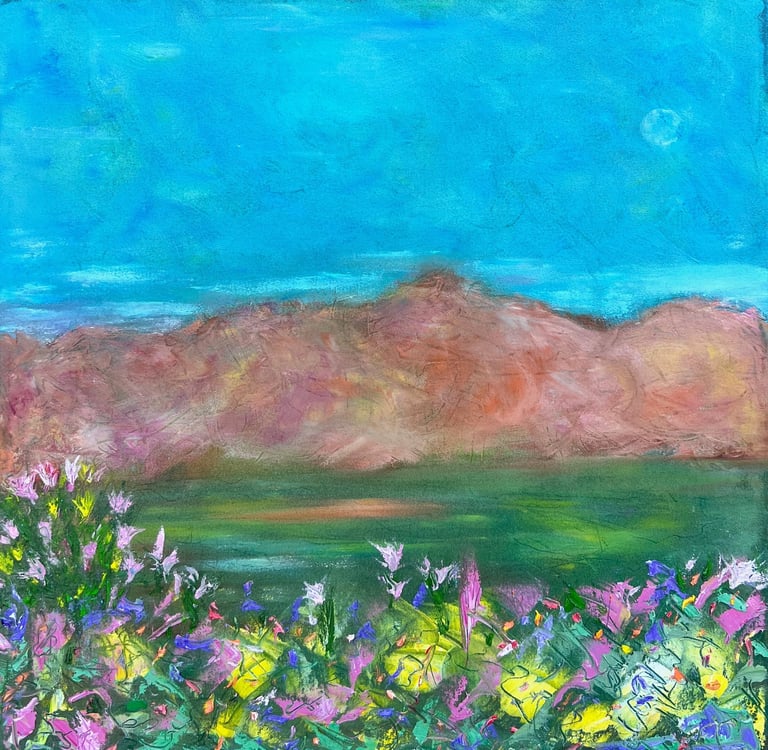 "Spring Morning" (2025) 22-by-22 oil on unprimed canvas. Inquire.