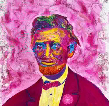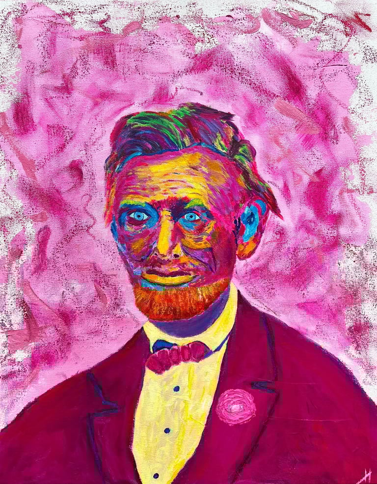 "Pink Lincoln" (2024) 16-by-20 mixed media on canvas. I worked from an AI-generated photograph based on Alexander Gardner's final photo of President Lincoln taken in Washington, D.C., in early 1865. Inquire.