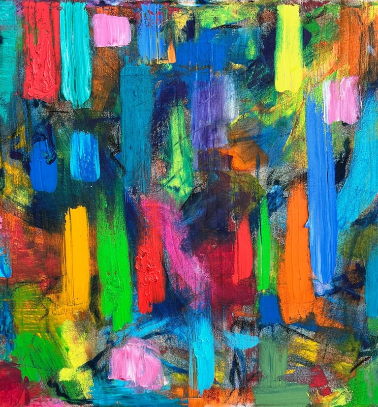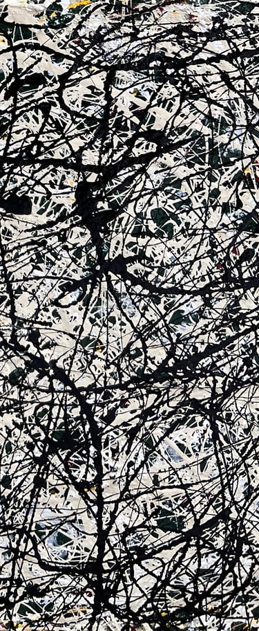 "Makers & Takers (Mini Fake Pollock)" (2025) 8-by-14 inches, Rust-Oleum Protective Enamel oil paint (gloss) over collage and acrylic paint on canvas. A small-scale tribute to the great abstract expressionist painter. Inquire.